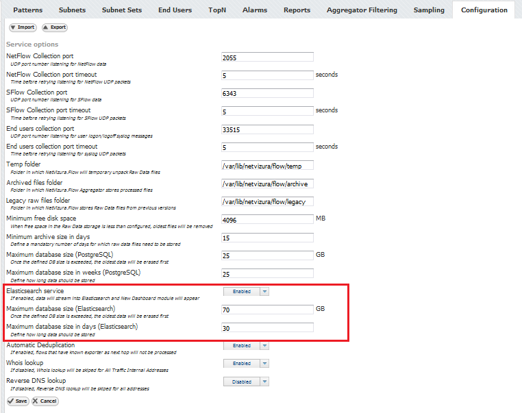 • Elasticsearch service - This configuration item is temporary. In future versions of NetVizura Elastic database will be the main database for storing NetFlow data, and users will be unable to turn it off or on. The default value is disabled.