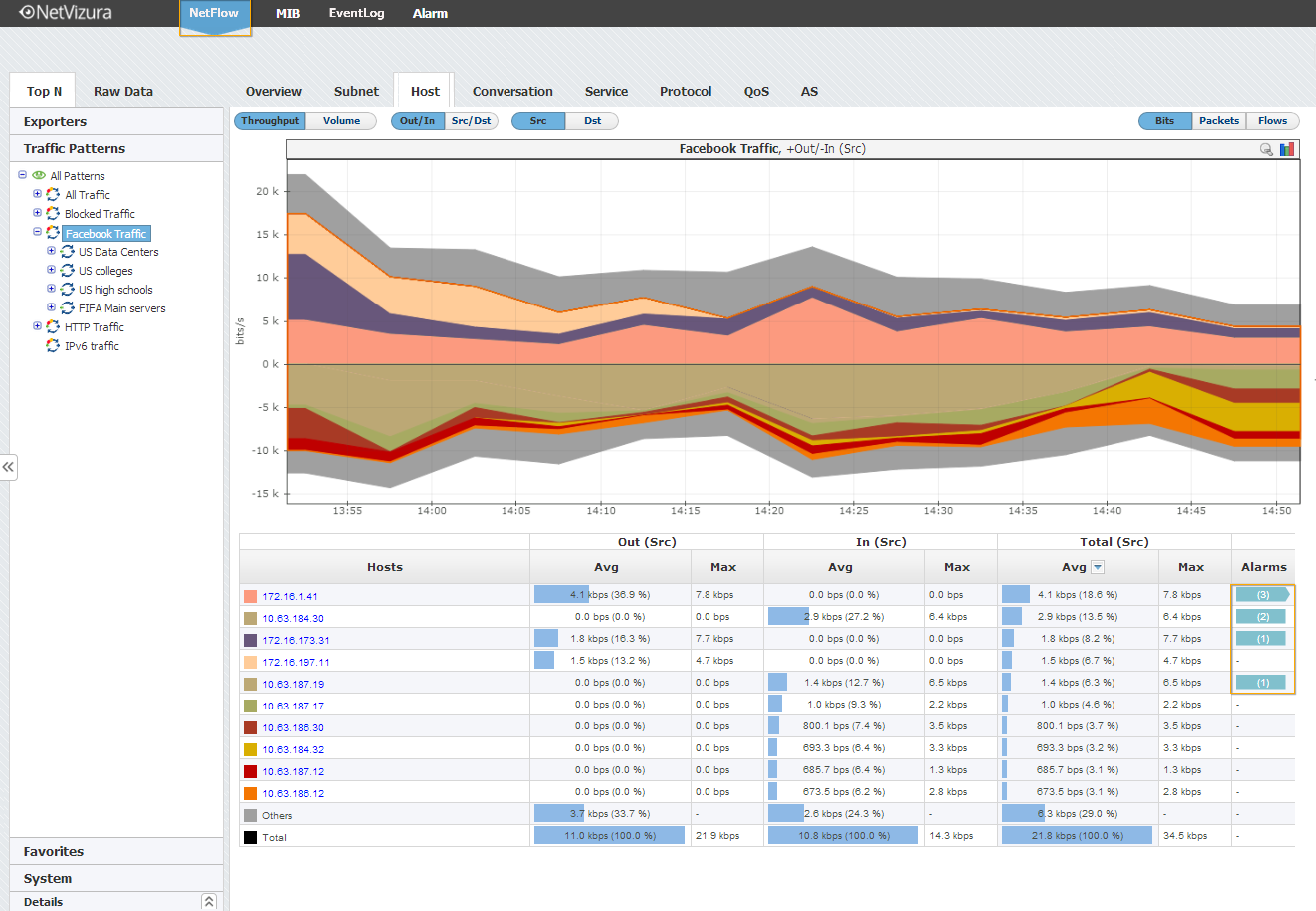 Alarms that occurred during Time Window specified are visible as indicators in the NetFlow Module within the Top talker table. For example, we can see below alarms for Facebook Traffic by hosts.