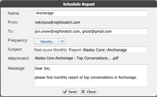 Existing reports are further managed in NetFlow Settings > Reports where scheduled reports can be edited, removed or cloned.