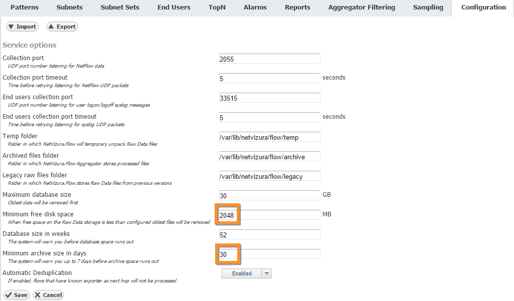 NetFlow Analyzer also warns you if your archive space is full and tells you exactly what actions are advised. Warnings are sent by email to NetVizura administrators and displayed when you log-in. Warning message is triggered when application concludes that Minimum free disc space will be reached before minimum amount of Raw Data files in days is stored (Minimum archive size in days).