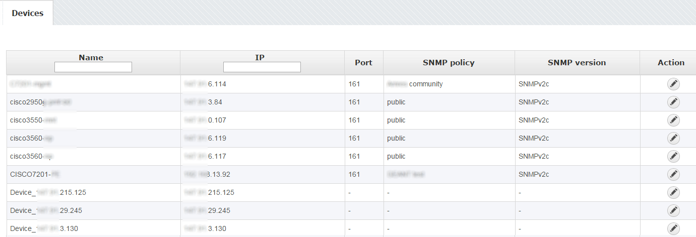 Looking at the first device “cisco2950-xx” you can see that the its IP address is x.x.3.84 and that the policy used on the device is “public”. Furthermore, you can see that the said policy is SNMP v2c and that the UDP port used for SNMP is 161.
