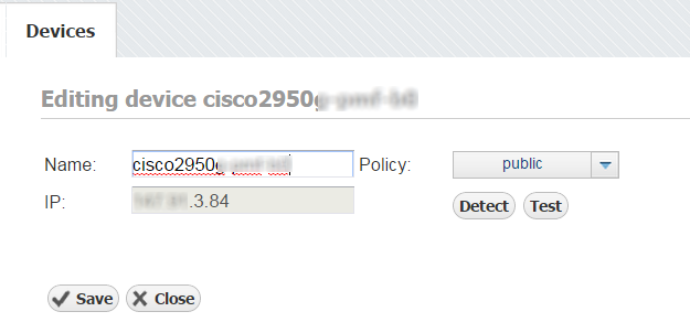 • If you do not know the SNMP configuration of the device and the corresponding policy, click on the Detect and the application will try each policy defined in the application on the device specified. If successful, the Policy field will be automatically updated.