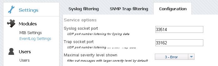 In service options you can set listening port for syslog and trap messages, and view preferences.